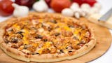 Pizza sauce base, BBQ chicken, mushrooms, red onions, mozzarella & cheddar cheese.